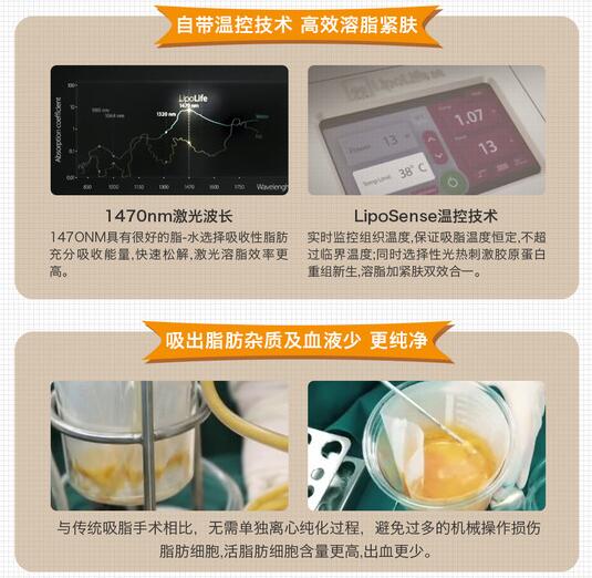 5G天使光雕也被叫做飞顿1470激光溶脂吸脂系统。具有着独立的吸脂管设备,在操作的时候能够GET使用激光分离脂肪和吸脂同时进行的一种方式,对于身体里面独立的脂肪层会及时分解,其实它是一种新型的溶脂和吸脂同时进行的全新溶脂吸脂仪器。