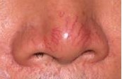酒糟鼻又名玫瑰痤疮,英文名Rosacea,中医别名赤鼻、酒齄鼻俗称红鼻子或红鼻头, 是一种发生于面部中央的慢性皮肤炎症。早期表现为在颜面中部发生弥漫性暗红色斑片,伴发丘疹、脓疱和毛细血管扩张,晚期出现鼻赘。本病常并发脂溢性皮炎。目前大多数学者认为毛囊虫感染是发病的重要因素,但不是唯独的因素。嗜酒、辛辣食物、高温及寒冷刺激、消化、内分泌障等也可促发本病。