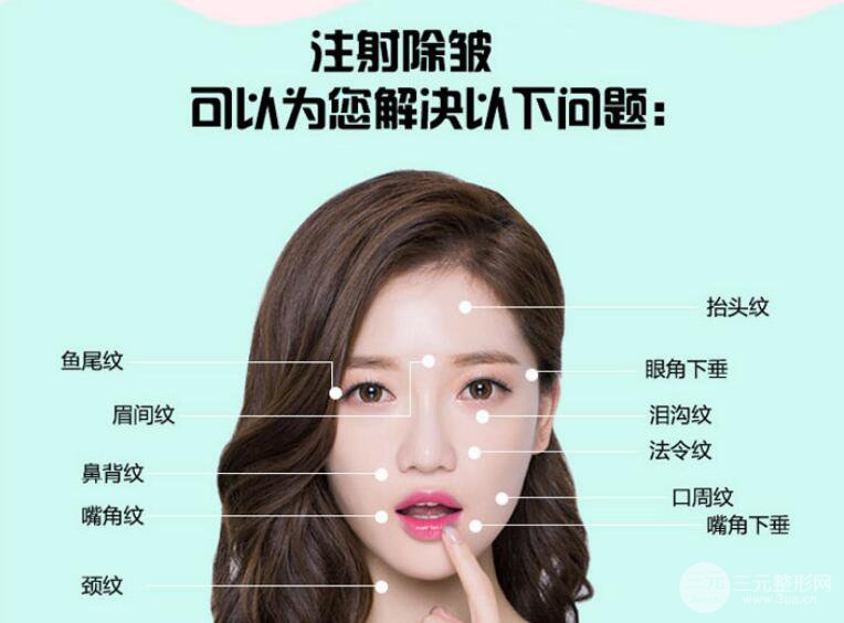 2、使用注射瘦脸去皱,一般鱼尾纹、额头纹、眉间纹、鼻唇沟纹和颈部皱纹都可以去除,但Z适用于早期的、不太明X的皱纹,而且皮肤不是很松垮的情况。