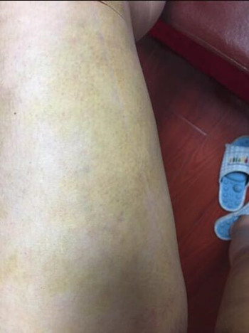 大腿还是有淤青,肿消了一些,现在每天都在坚持都运动,多走走,就希望大腿恢复的**!